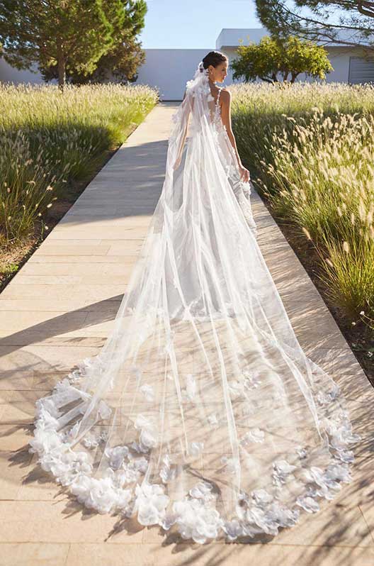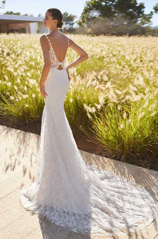 Long mermaid wedding dress in lace with beading deep neckline, floral straps, open back.