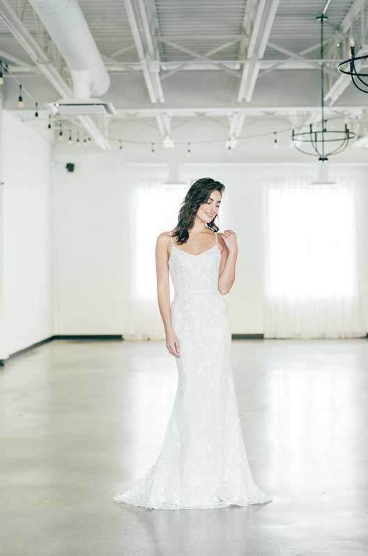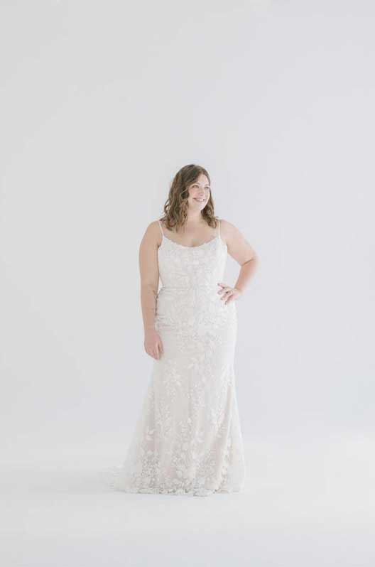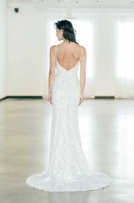 Sequinned vine lace appliqué over Swiss dot tulle, scooped neckline, ultra low scooped back with adjustable spaghetti straps. Fabric belt, fit and flare skirt with illusion sweep train, decorative buttons down invisible zip.
