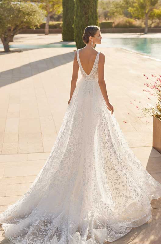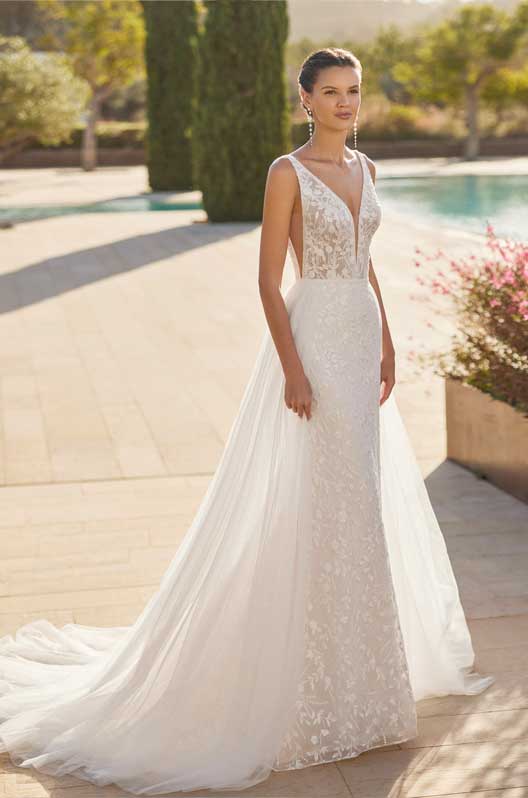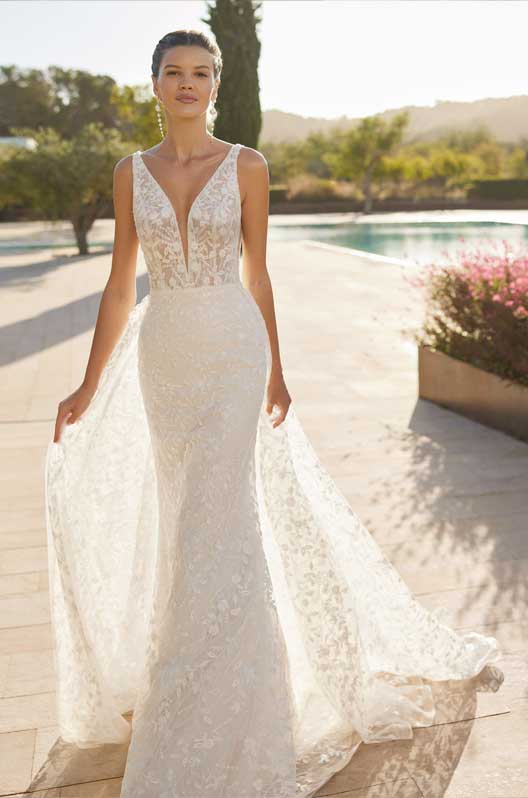 Long two-piece mermaid wedding dress in lace with beading, V-neckline, straps, V-back, and lace overskirt.